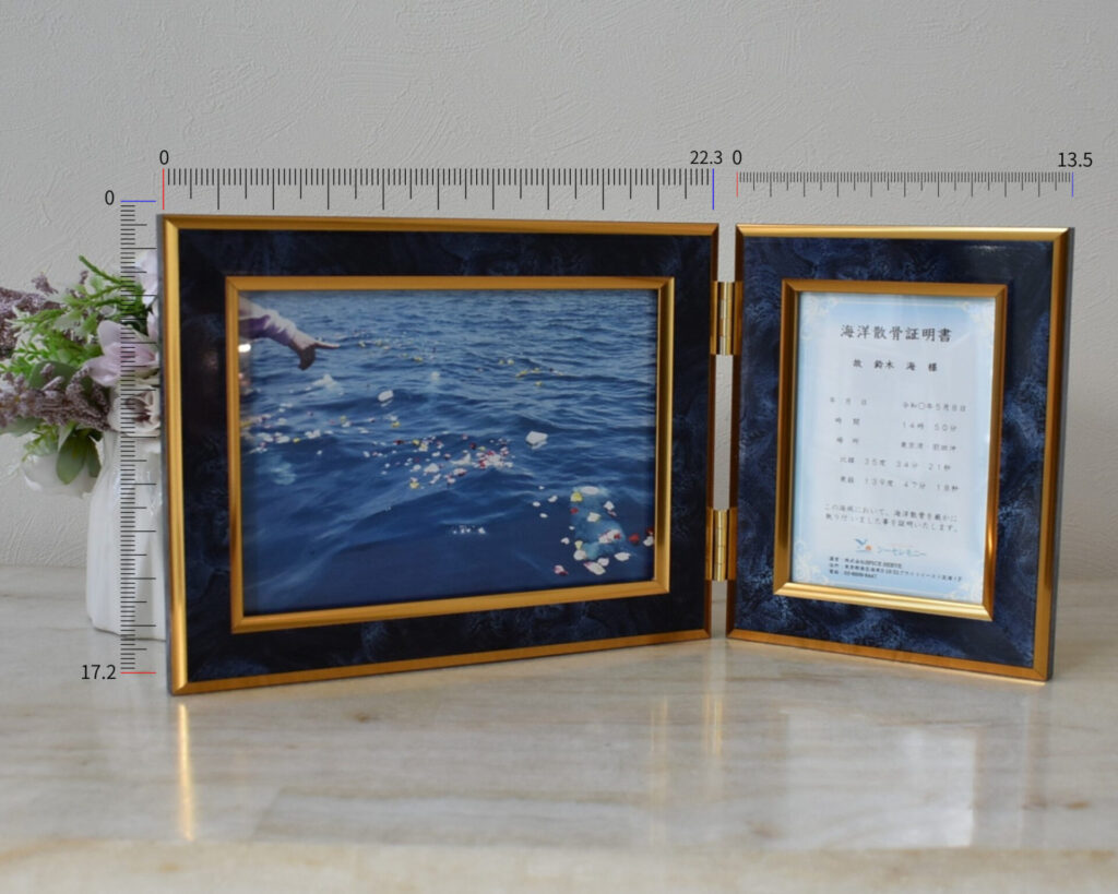 この度、散骨証明書の形式を「証書ファイル」と「写真立て」の2種類からお選びいただけるようになりました。