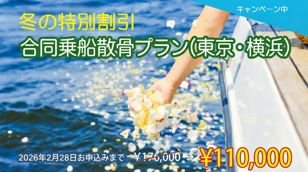 東京・横浜の合同乗船散骨プランが、通常176,000円(税込)のところ、110,000円(税込)でご利用いただける冬限定の特別キャンペーンを実施しております。